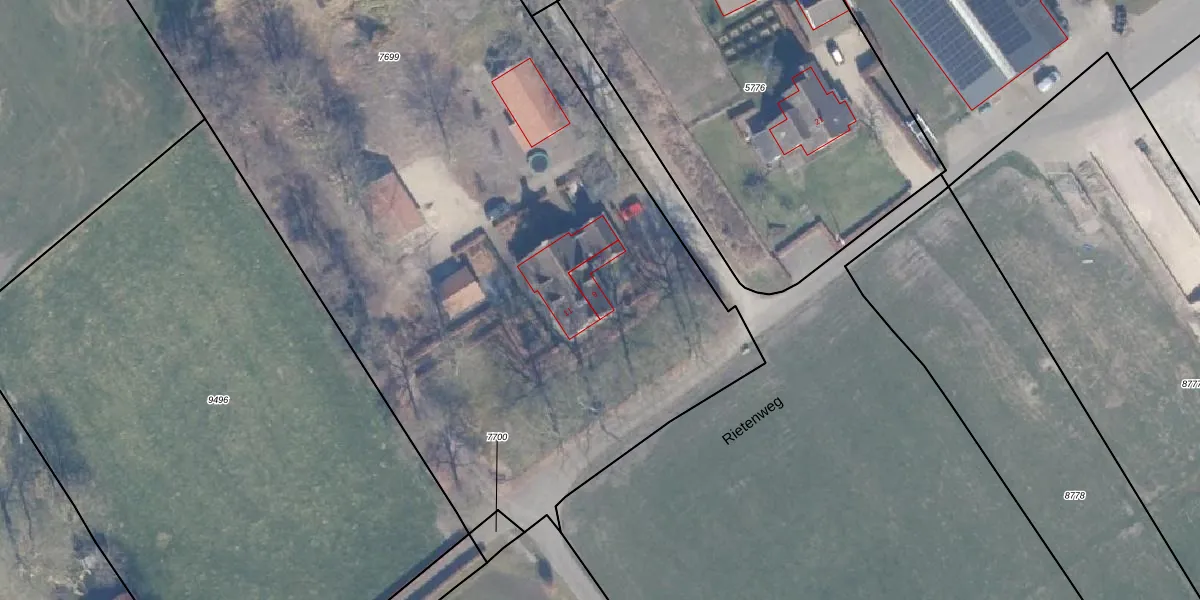 Het perceel waarop Rietenweg 9 staat heeft een oppervlakte van 7770 m². Dit is een zeer groot perceel. De perceeloppervlakte wordt geregistreerd door het Kadaster. Gedetailleerde informatie over de maten van dit perceel kunt u vinden in het rapport Kadastrale kaart met maatvoering van Rietenweg 9.