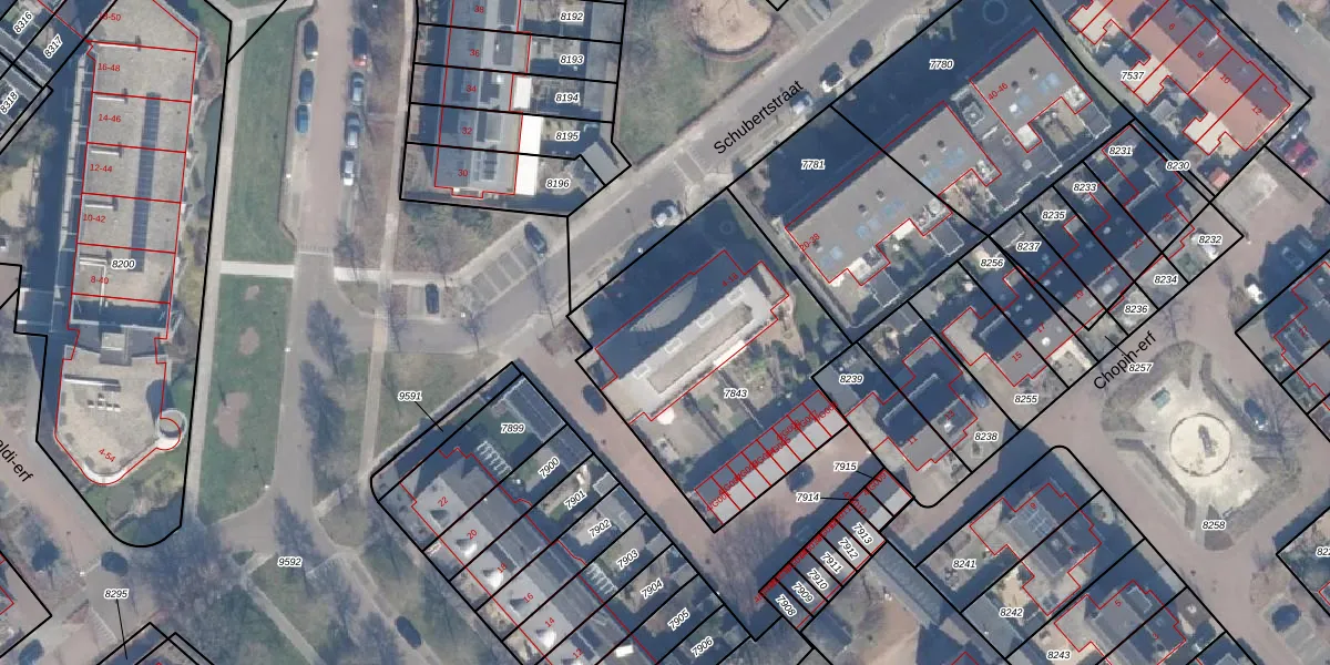 Het perceel waarop Schubertstraat 6 staat heeft een oppervlakte van 1240 m². Dit is een zeer groot perceel. De perceeloppervlakte wordt geregistreerd door het Kadaster. Gedetailleerde informatie over de maten van dit perceel kunt u vinden in het rapport Kadastrale kaart met maatvoering van Schubertstraat 6.