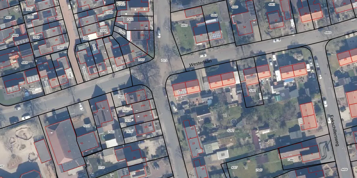 Het perceel waarop Westerlaan 45 staat heeft een oppervlakte van 5147 m². Dit is een zeer groot perceel. De perceeloppervlakte wordt geregistreerd door het Kadaster. Gedetailleerde informatie over de maten van dit perceel kunt u vinden in het rapport Kadastrale kaart met maatvoering van Westerlaan 45.