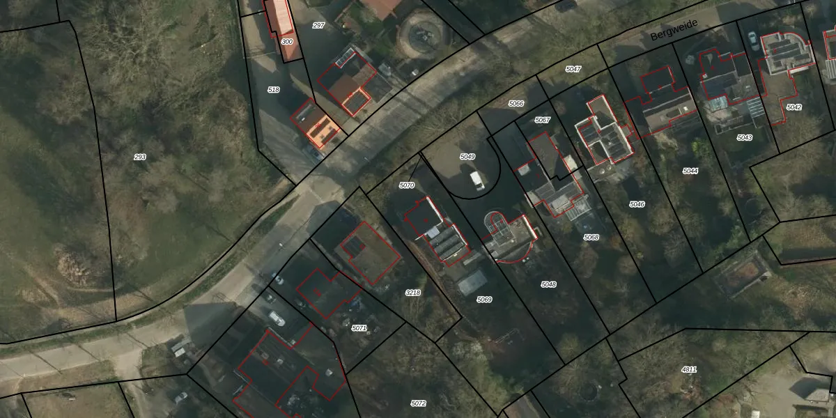 Het perceel waarop Bergweide 9 staat heeft een oppervlakte van 1065 m². Dit is een zeer groot perceel. De perceeloppervlakte wordt geregistreerd door het Kadaster. Gedetailleerde informatie over de maten van dit perceel kunt u vinden in het rapport Kadastrale kaart met maatvoering van Bergweide 9.