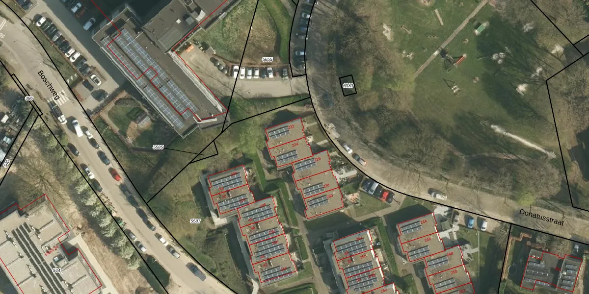 Het perceel waarop Donatusstraat 224 staat heeft een oppervlakte van 6565 m². Dit is een zeer groot perceel. De perceeloppervlakte wordt geregistreerd door het Kadaster. Gedetailleerde informatie over de maten van dit perceel kunt u vinden in het rapport Kadastrale kaart met maatvoering van Donatusstraat 224.