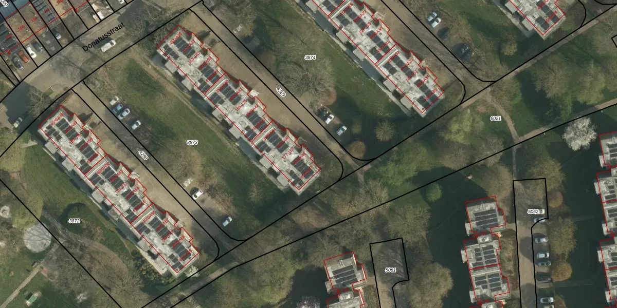 Het perceel waarop Donatusstraat 45-GA47 staat heeft een oppervlakte van 3160 m². Dit is een zeer groot perceel. De perceeloppervlakte wordt geregistreerd door het Kadaster. Gedetailleerde informatie over de maten van dit perceel kunt u vinden in het rapport Kadastrale kaart met maatvoering van Donatusstraat 45-GA47.