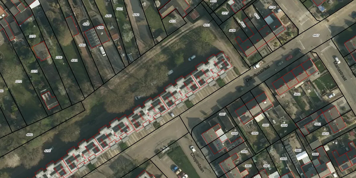 Het perceel waarop Donatusstraat 54 staat heeft een oppervlakte van 7510 m². Dit is een zeer groot perceel. De perceeloppervlakte wordt geregistreerd door het Kadaster. Gedetailleerde informatie over de maten van dit perceel kunt u vinden in het rapport Kadastrale kaart met maatvoering van Donatusstraat 54.