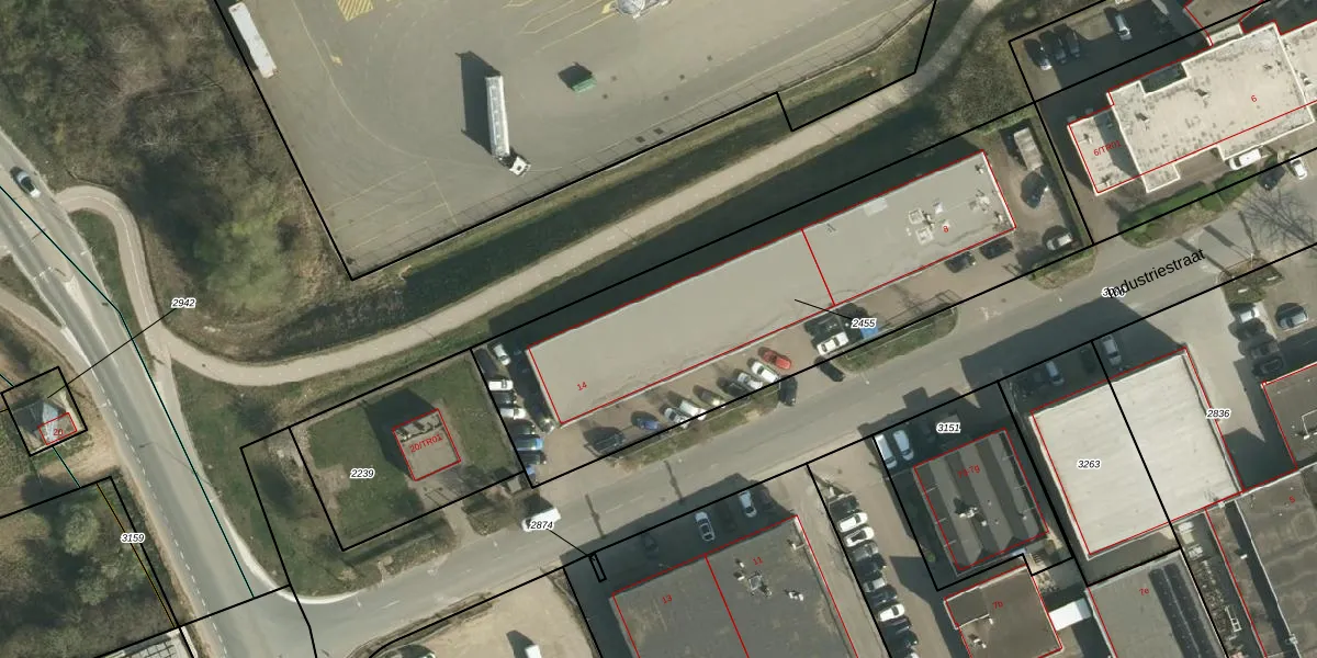 Industriestraat 14 is gelegen op kadastraal perceel NUT00A2455. Deze kadastrale aanduiding is uniek en wordt gebruikt door het Kadaster om eigendomsrechten en andere zakelijke rechten vast te leggen. Het perceel maakt onderdeel uit van de kadastrale gemeente Nuth.