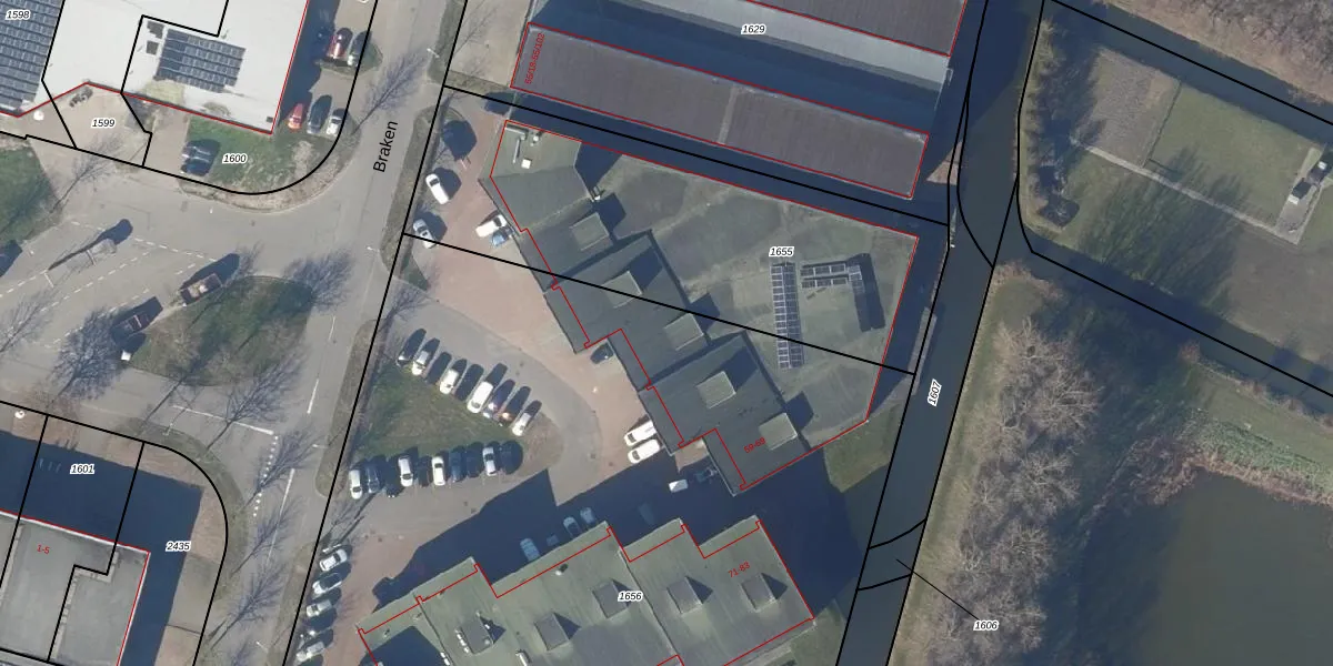Het perceel waarop Braken 65 staat heeft een oppervlakte van 6555 m². Dit is een zeer groot perceel. De perceeloppervlakte wordt geregistreerd door het Kadaster. Gedetailleerde informatie over de maten van dit perceel kunt u vinden in het rapport Kadastrale kaart met maatvoering van Braken 65.