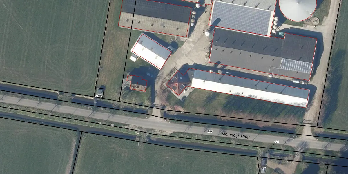 Het perceel waarop Molendijksweg 2 staat heeft een oppervlakte van 1,5 ha. Dit is een zeer groot perceel. De perceeloppervlakte wordt geregistreerd door het Kadaster. Gedetailleerde informatie over de maten van dit perceel kunt u vinden in het rapport Kadastrale kaart met maatvoering van Molendijksweg 2.
