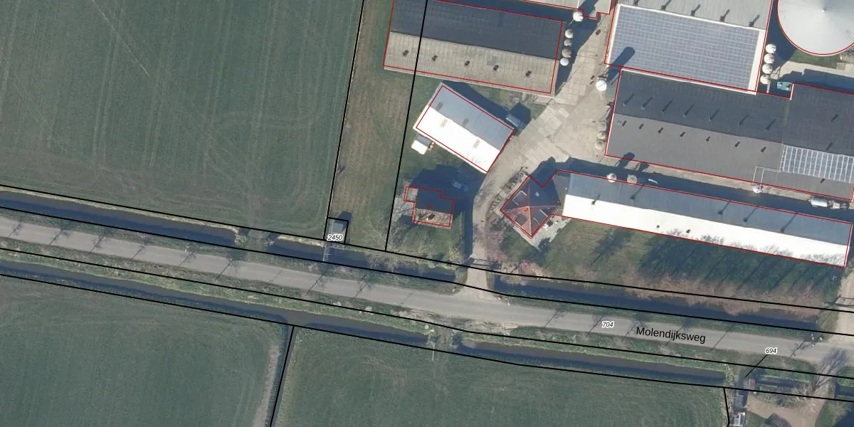Het perceel waarop Molendijksweg 4 staat heeft een oppervlakte van 1,5 ha. Dit is een zeer groot perceel. De perceeloppervlakte wordt geregistreerd door het Kadaster. Gedetailleerde informatie over de maten van dit perceel kunt u vinden in het rapport Kadastrale kaart met maatvoering van Molendijksweg 4.