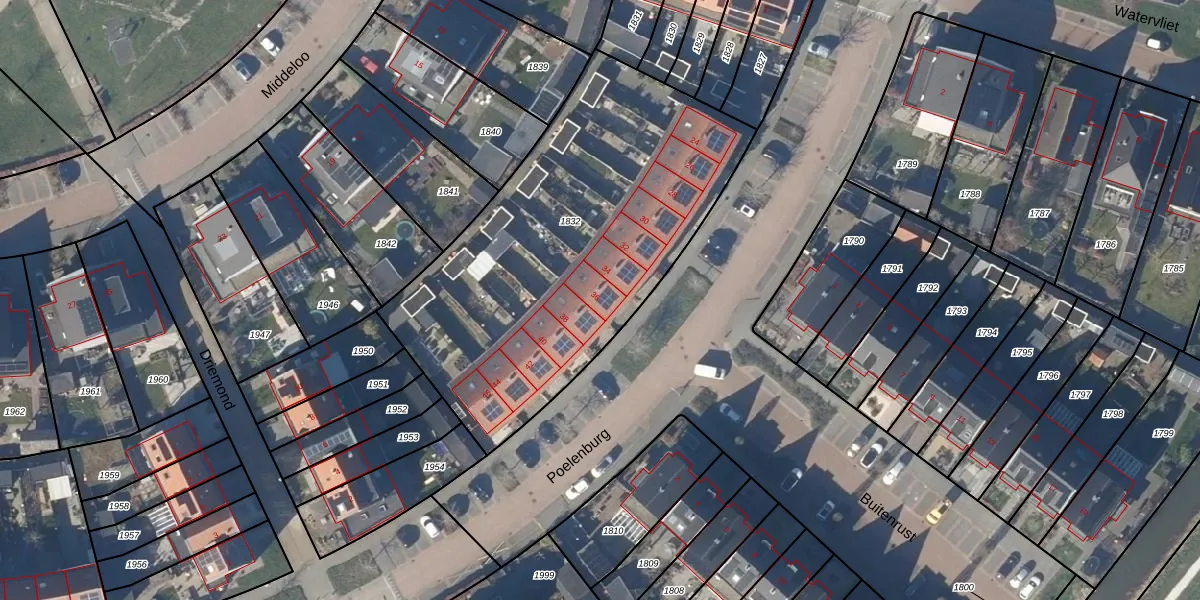 Het perceel waarop Poelenburg 36 staat heeft een oppervlakte van 1947 m². Dit is een zeer groot perceel. De perceeloppervlakte wordt geregistreerd door het Kadaster. Gedetailleerde informatie over de maten van dit perceel kunt u vinden in het rapport Kadastrale kaart met maatvoering van Poelenburg 36.