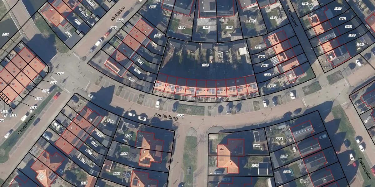 Het perceel waarop Poelenburg 60 staat heeft een oppervlakte van 1590 m². Dit is een zeer groot perceel. De perceeloppervlakte wordt geregistreerd door het Kadaster. Gedetailleerde informatie over de maten van dit perceel kunt u vinden in het rapport Kadastrale kaart met maatvoering van Poelenburg 60.