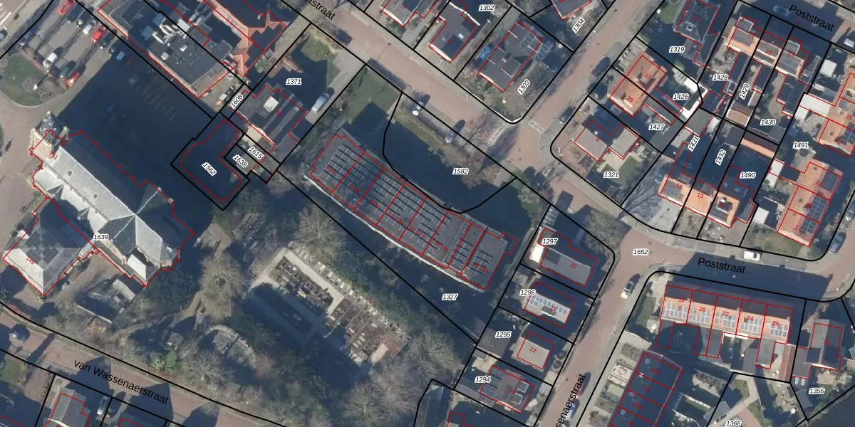 Het perceel waarop Poststraat 12 staat heeft een oppervlakte van 1540 m². Dit is een zeer groot perceel. De perceeloppervlakte wordt geregistreerd door het Kadaster. Gedetailleerde informatie over de maten van dit perceel kunt u vinden in het rapport Kadastrale kaart met maatvoering van Poststraat 12.