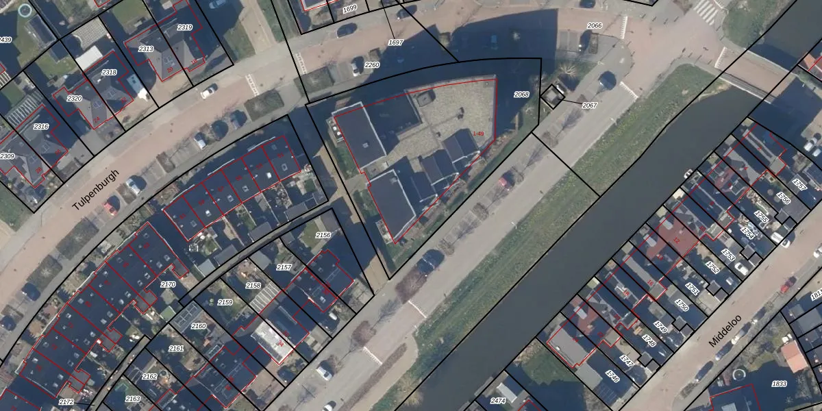 Het perceel waarop Tulpenburgh 9 staat heeft een oppervlakte van 1730 m². Dit is een zeer groot perceel. De perceeloppervlakte wordt geregistreerd door het Kadaster. Gedetailleerde informatie over de maten van dit perceel kunt u vinden in het rapport Kadastrale kaart met maatvoering van Tulpenburgh 9.