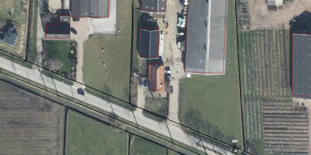 Het perceel waarop Bonegraafseweg 55 staat heeft een oppervlakte van 1,4 ha. Dit is een zeer groot perceel. De perceeloppervlakte wordt geregistreerd door het Kadaster. Gedetailleerde informatie over de maten van dit perceel kunt u vinden in het rapport Kadastrale kaart met maatvoering van Bonegraafseweg 55.