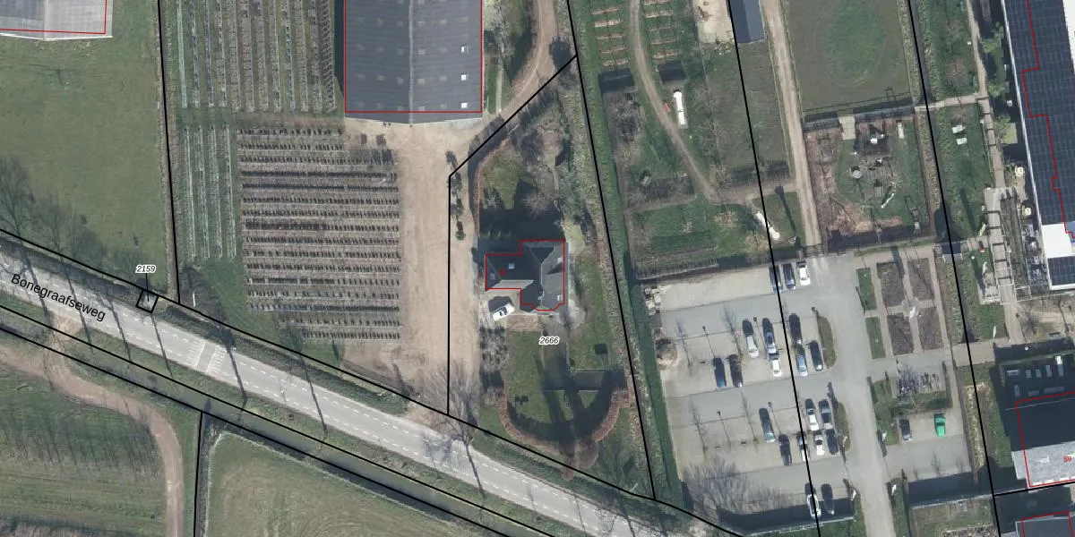 Het perceel waarop Bonegraafseweg 57 staat heeft een oppervlakte van 2015 m². Dit is een zeer groot perceel. De perceeloppervlakte wordt geregistreerd door het Kadaster. Gedetailleerde informatie over de maten van dit perceel kunt u vinden in het rapport Kadastrale kaart met maatvoering van Bonegraafseweg 57.