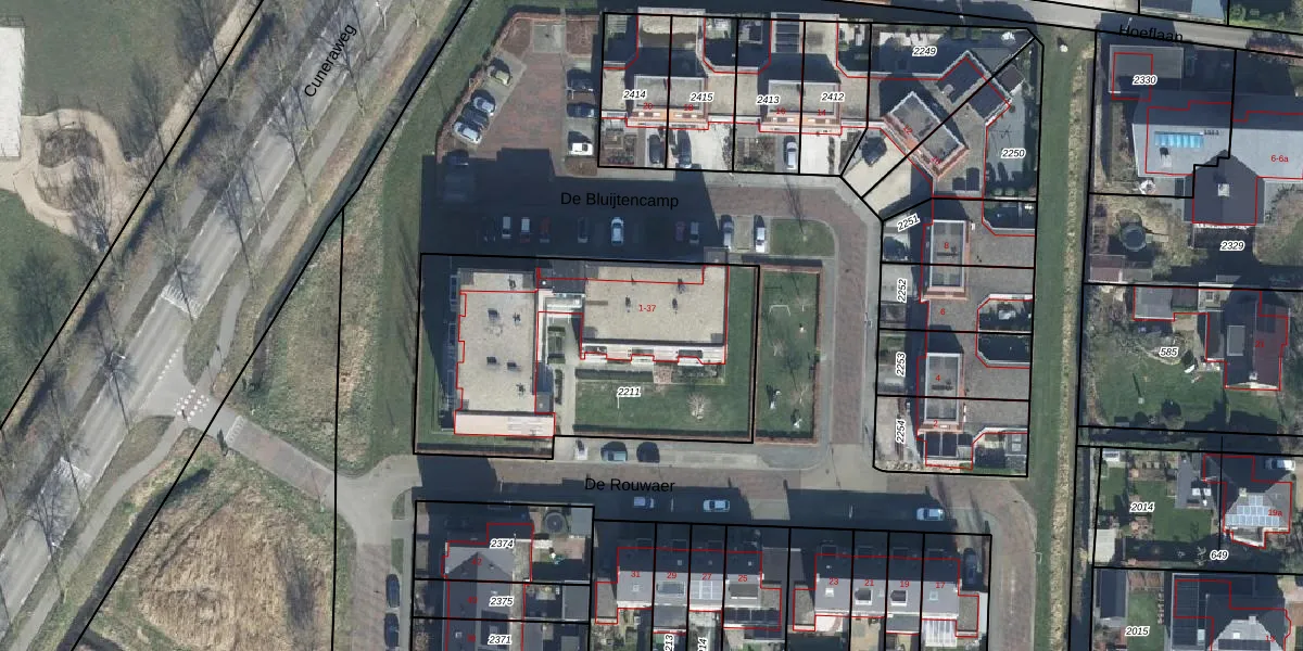 Het perceel waarop De Bluijtencamp 23 staat heeft een oppervlakte van 1488 m². Dit is een zeer groot perceel. De perceeloppervlakte wordt geregistreerd door het Kadaster. Gedetailleerde informatie over de maten van dit perceel kunt u vinden in het rapport Kadastrale kaart met maatvoering van De Bluijtencamp 23.