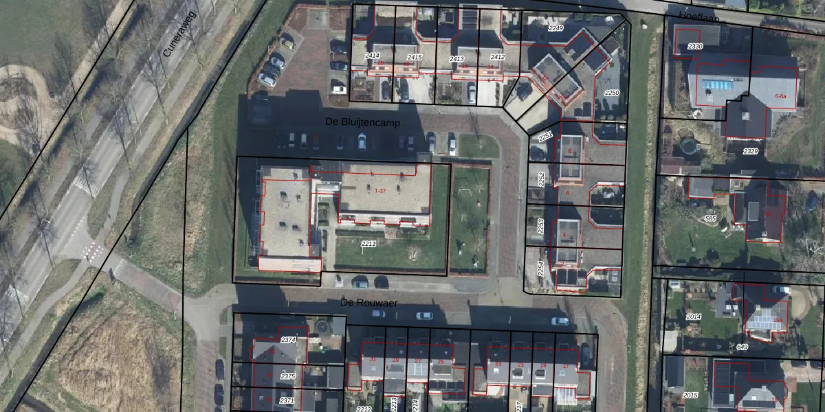 Het perceel waarop De Bluijtencamp 35 staat heeft een oppervlakte van 1488 m². Dit is een zeer groot perceel. De perceeloppervlakte wordt geregistreerd door het Kadaster. Gedetailleerde informatie over de maten van dit perceel kunt u vinden in het rapport Kadastrale kaart met maatvoering van De Bluijtencamp 35.