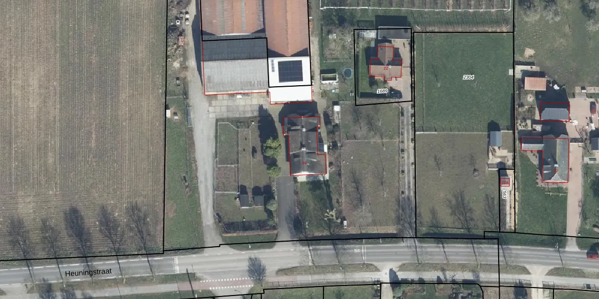 Heuningstraat 24 is gelegen op kadastraal perceel OTN00F2303. Deze kadastrale aanduiding is uniek en wordt gebruikt door het Kadaster om eigendomsrechten en andere zakelijke rechten vast te leggen. Het perceel maakt onderdeel uit van de kadastrale gemeente Ochten.