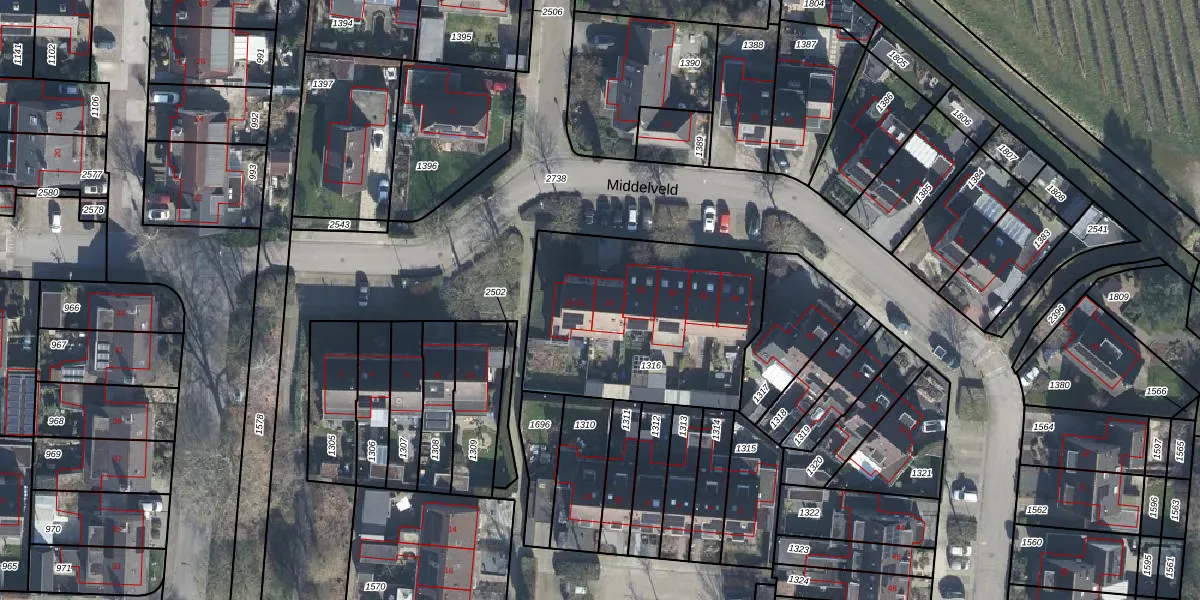 Het perceel waarop Middelveld 16 staat heeft een oppervlakte van 1004 m². Dit is een zeer groot perceel. De perceeloppervlakte wordt geregistreerd door het Kadaster. Gedetailleerde informatie over de maten van dit perceel kunt u vinden in het rapport Kadastrale kaart met maatvoering van Middelveld 16.