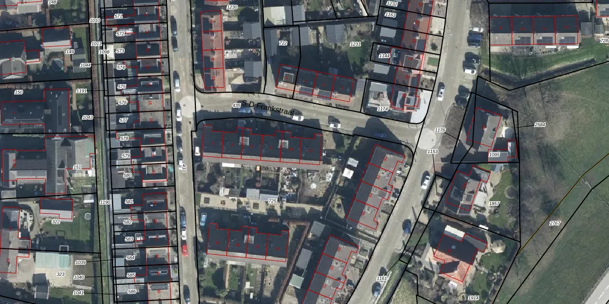 S D Frankstraat 12 is gelegen op kadastraal perceel OTN00E725. Deze kadastrale aanduiding is uniek en wordt gebruikt door het Kadaster om eigendomsrechten en andere zakelijke rechten vast te leggen. Het perceel maakt onderdeel uit van de kadastrale gemeente Ochten.