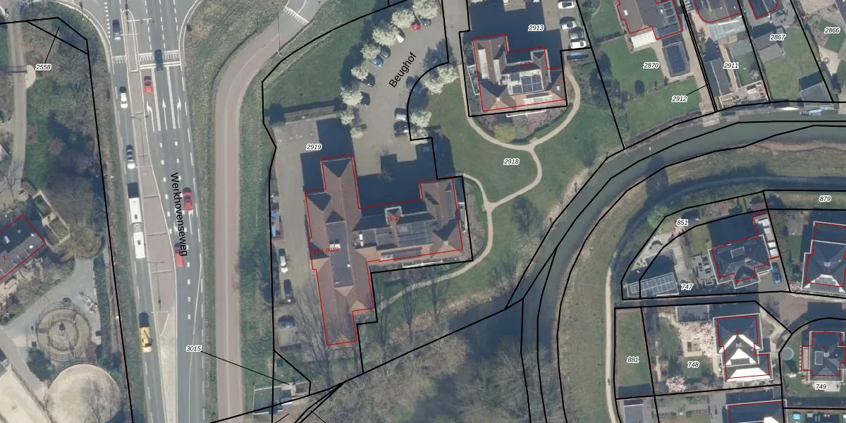 Het perceel waarop Beughof 17 staat heeft een oppervlakte van 2960 m². Dit is een zeer groot perceel. De perceeloppervlakte wordt geregistreerd door het Kadaster. Gedetailleerde informatie over de maten van dit perceel kunt u vinden in het rapport Kadastrale kaart met maatvoering van Beughof 17.