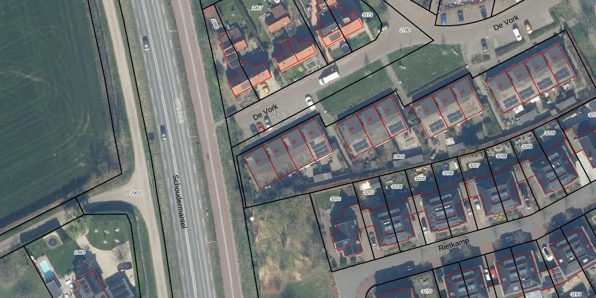 Het perceel waarop De Vork 32 staat heeft een oppervlakte van 2840 m². Dit is een zeer groot perceel. De perceeloppervlakte wordt geregistreerd door het Kadaster. Gedetailleerde informatie over de maten van dit perceel kunt u vinden in het rapport Kadastrale kaart met maatvoering van De Vork 32.