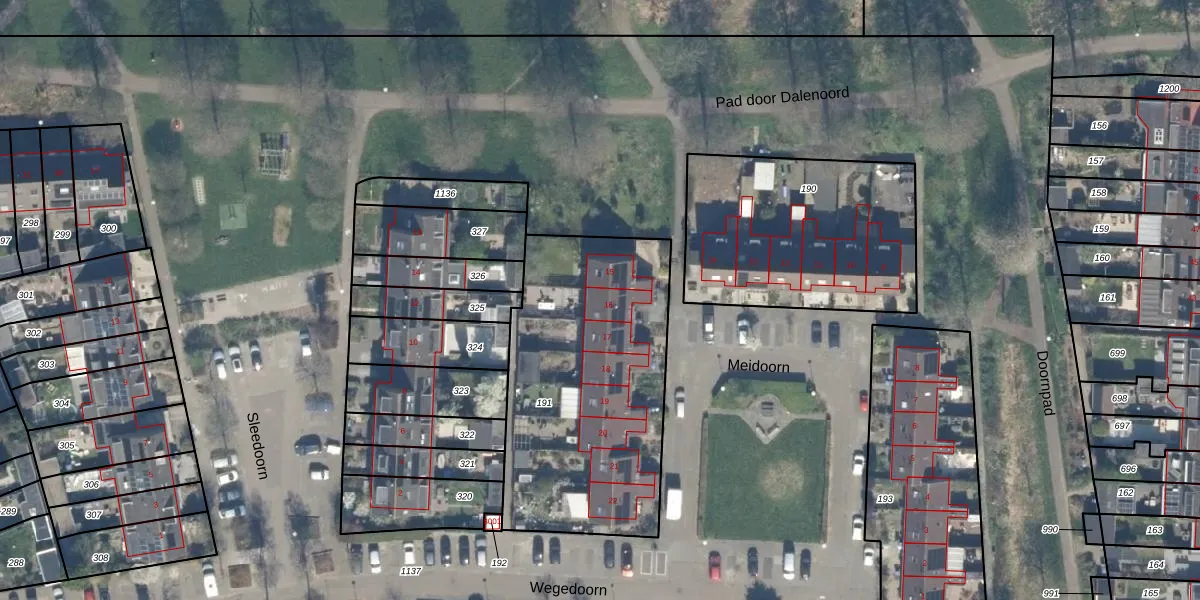 Het perceel waarop Meidoorn 16 staat heeft een oppervlakte van 1280 m². Dit is een zeer groot perceel. De perceeloppervlakte wordt geregistreerd door het Kadaster. Gedetailleerde informatie over de maten van dit perceel kunt u vinden in het rapport Kadastrale kaart met maatvoering van Meidoorn 16.