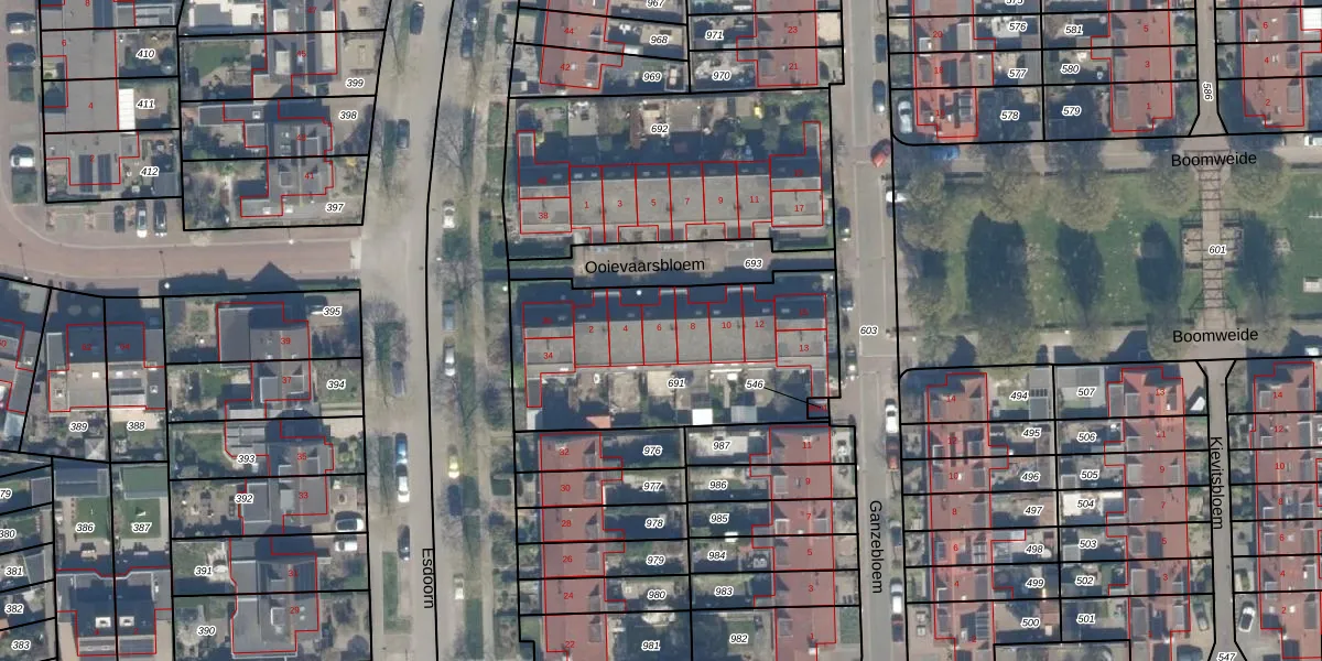 Het perceel waarop Ooievaarsbloem 6 staat heeft een oppervlakte van 1065 m². Dit is een zeer groot perceel. De perceeloppervlakte wordt geregistreerd door het Kadaster. Gedetailleerde informatie over de maten van dit perceel kunt u vinden in het rapport Kadastrale kaart met maatvoering van Ooievaarsbloem 6.