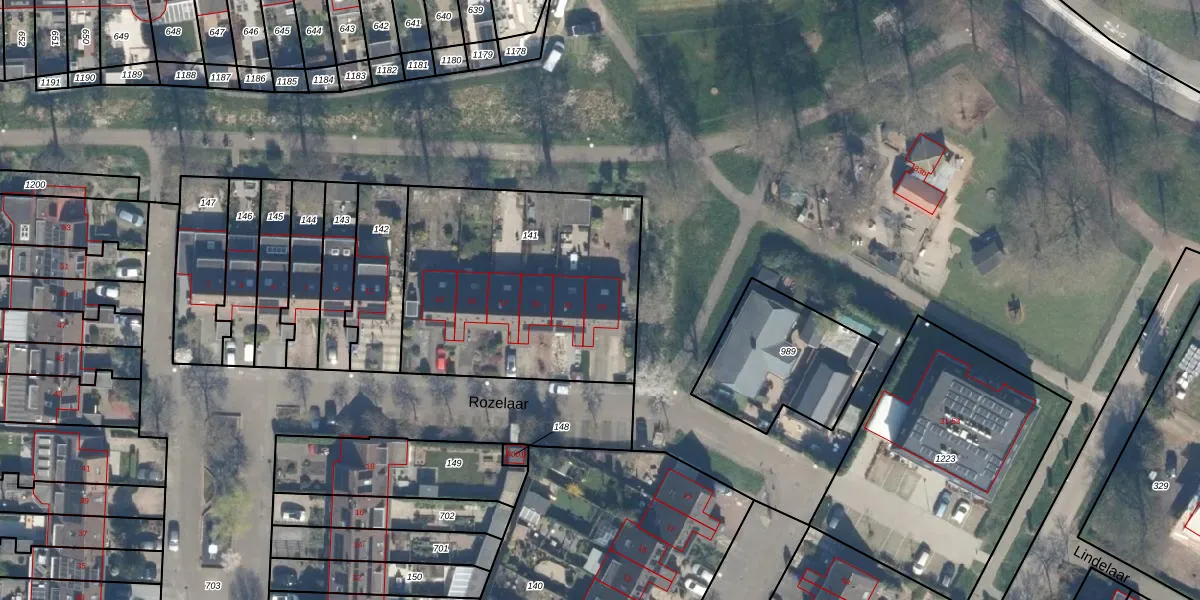 Het perceel waarop Rozelaar 23 staat heeft een oppervlakte van 1215 m². Dit is een zeer groot perceel. De perceeloppervlakte wordt geregistreerd door het Kadaster. Gedetailleerde informatie over de maten van dit perceel kunt u vinden in het rapport Kadastrale kaart met maatvoering van Rozelaar 23.