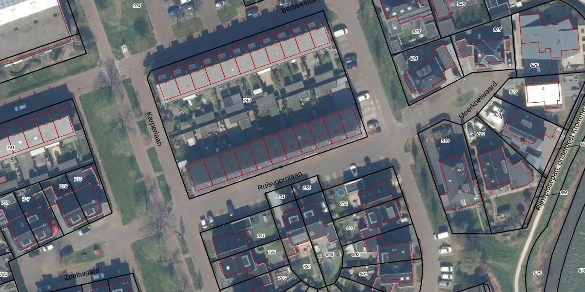 Het perceel waarop Ruisvoornlaan 13 staat heeft een oppervlakte van 2957 m². Dit is een zeer groot perceel. De perceeloppervlakte wordt geregistreerd door het Kadaster. Gedetailleerde informatie over de maten van dit perceel kunt u vinden in het rapport Kadastrale kaart met maatvoering van Ruisvoornlaan 13.