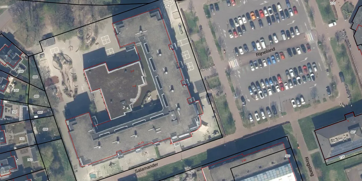 Het perceel waarop Salamander 3 staat heeft een oppervlakte van 6970 m². Dit is een zeer groot perceel. De perceeloppervlakte wordt geregistreerd door het Kadaster. Gedetailleerde informatie over de maten van dit perceel kunt u vinden in het rapport Kadastrale kaart met maatvoering van Salamander 3.