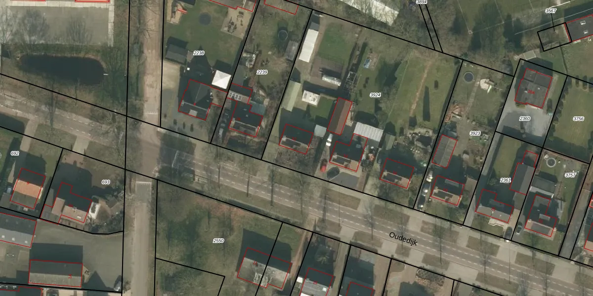 Het perceel waarop Oudedijk 12 staat heeft een oppervlakte van 2855 m². Dit is een zeer groot perceel. De perceeloppervlakte wordt geregistreerd door het Kadaster. Gedetailleerde informatie over de maten van dit perceel kunt u vinden in het rapport Kadastrale kaart met maatvoering van Oudedijk 12.