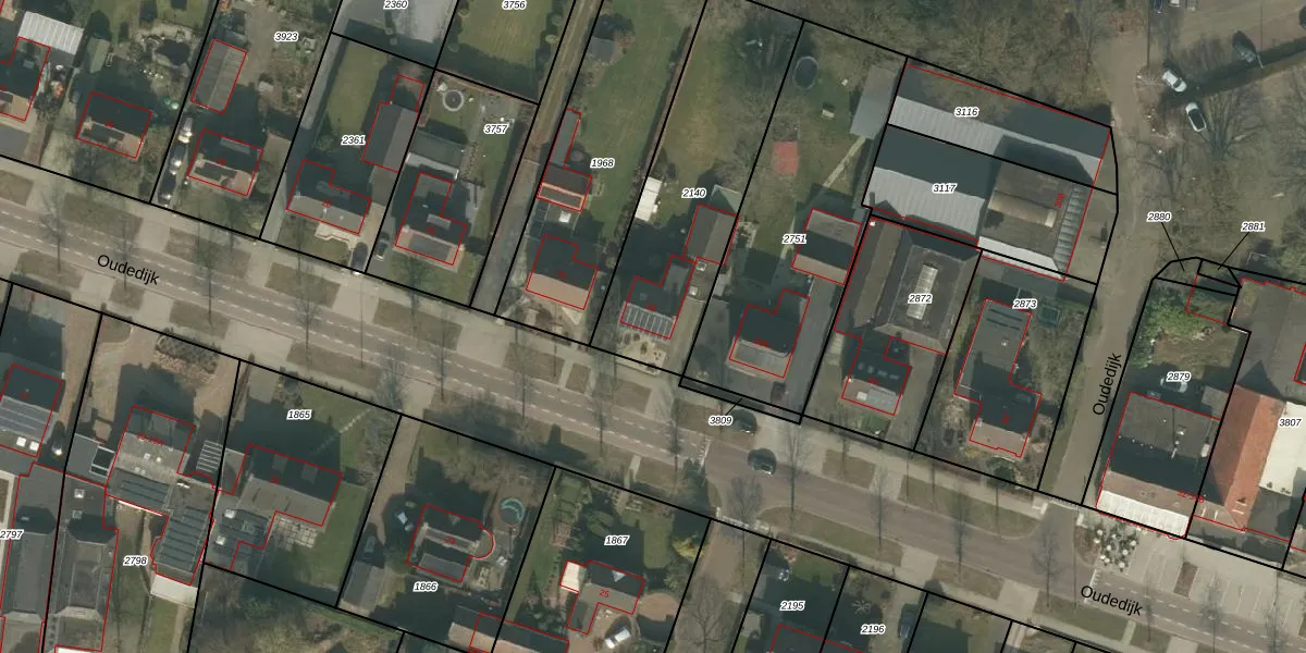 Het perceel waarop Oudedijk 26 staat heeft een oppervlakte van 875 m². Dit is een groot perceel. De perceeloppervlakte wordt geregistreerd door het Kadaster. Gedetailleerde informatie over de maten van dit perceel kunt u vinden in het rapport Kadastrale kaart met maatvoering van Oudedijk 26.