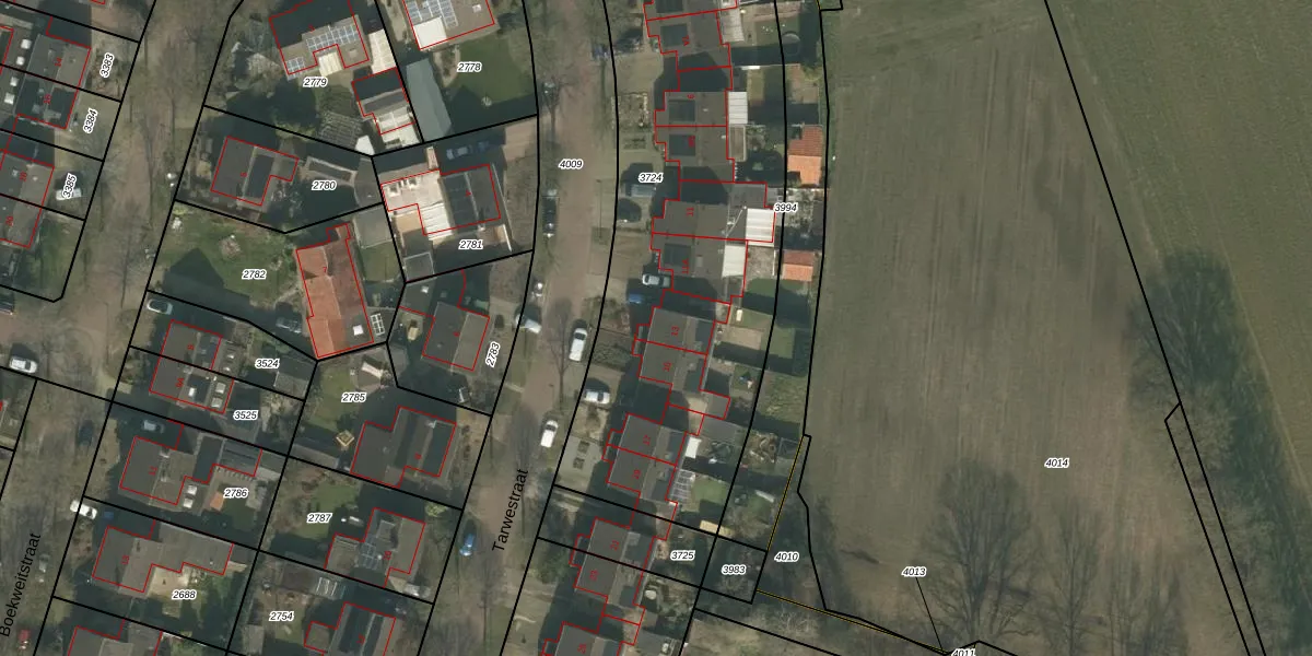Tarwestraat 13 is gelegen op kadastraal perceel UDN00D3724. Deze kadastrale aanduiding is uniek en wordt gebruikt door het Kadaster om eigendomsrechten en andere zakelijke rechten vast te leggen. Het perceel maakt onderdeel uit van de kadastrale gemeente Uden.