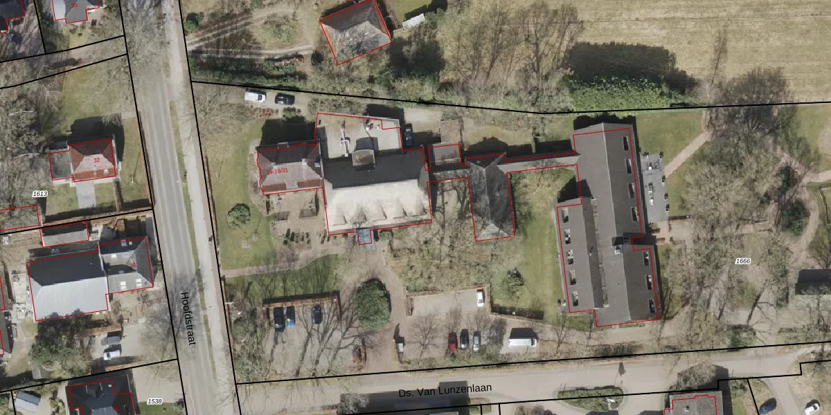 Het perceel waarop Hoofdstraat 19-05 staat heeft een oppervlakte van 1,6 ha. Dit is een zeer groot perceel. De perceeloppervlakte wordt geregistreerd door het Kadaster. Gedetailleerde informatie over de maten van dit perceel kunt u vinden in het rapport Kadastrale kaart met maatvoering van Hoofdstraat 19-05.