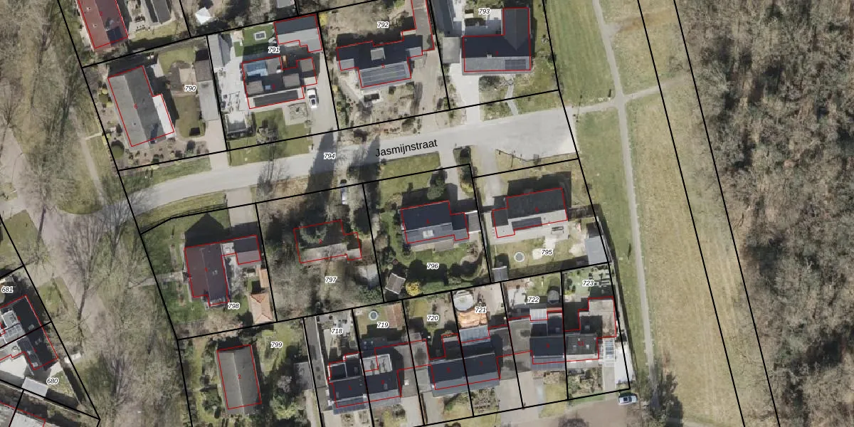 Het perceel waarop Jasmijnstraat 4 staat heeft een oppervlakte van 721 m². Dit is een groot perceel. De perceeloppervlakte wordt geregistreerd door het Kadaster. Gedetailleerde informatie over de maten van dit perceel kunt u vinden in het rapport Kadastrale kaart met maatvoering van Jasmijnstraat 4.