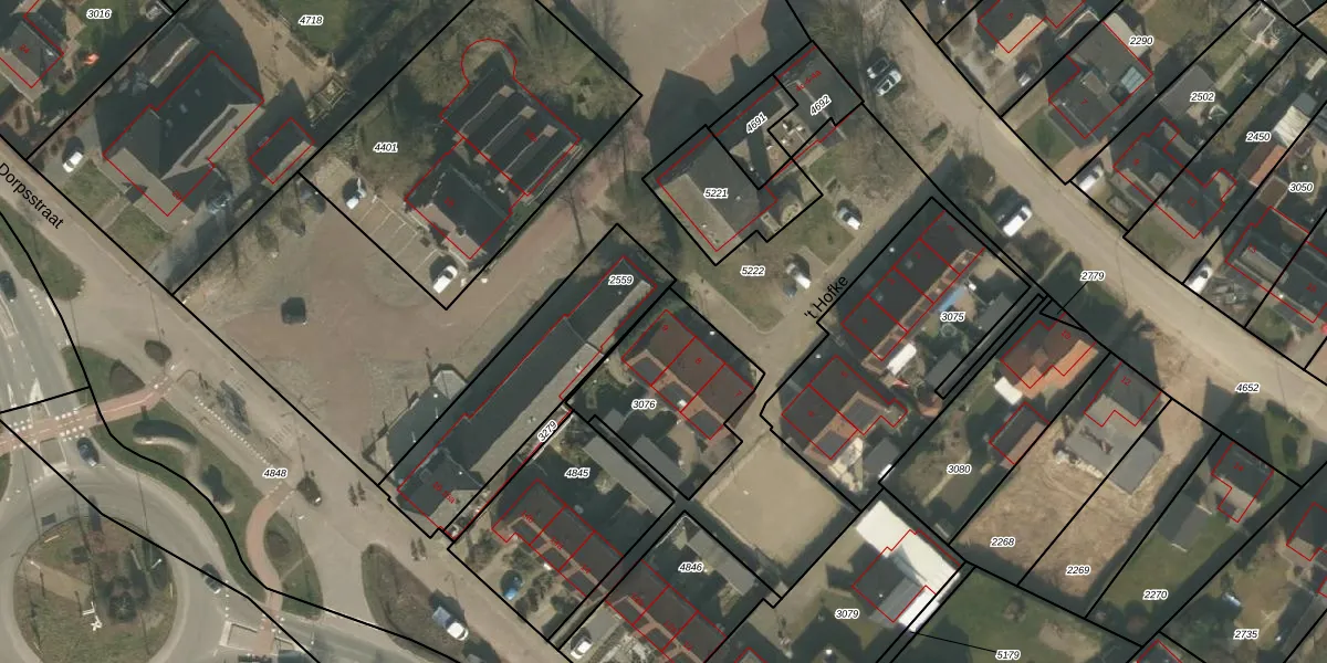 Het perceel waarop 't Hofke 9 staat heeft een oppervlakte van 488 m². Dit is een groot perceel. De perceeloppervlakte wordt geregistreerd door het Kadaster. Gedetailleerde informatie over de maten van dit perceel kunt u vinden in het rapport Kadastrale kaart met maatvoering van 't Hofke 9.