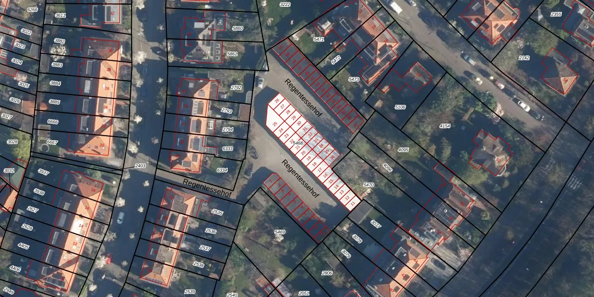 Het perceel waarop Regentessehof 21 staat heeft een oppervlakte van 1835 m². Dit is een zeer groot perceel. De perceeloppervlakte wordt geregistreerd door het Kadaster. Gedetailleerde informatie over de maten van dit perceel kunt u vinden in het rapport Kadastrale kaart met maatvoering van Regentessehof 21.