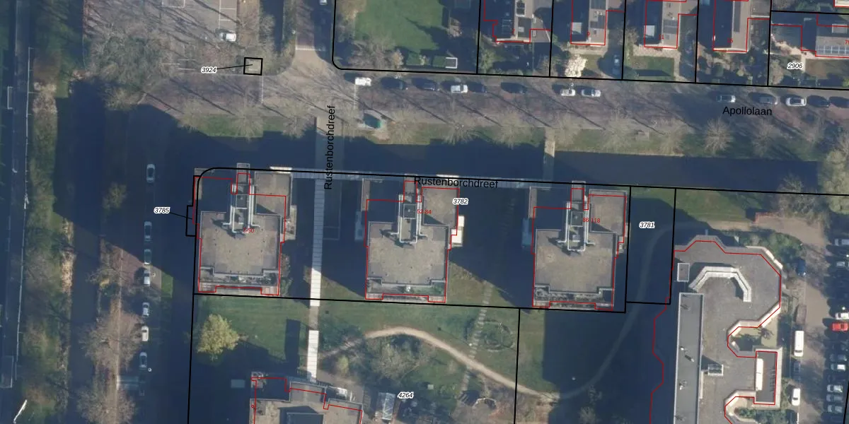 Het perceel waarop Rustenborchdreef 52 staat heeft een oppervlakte van 3042 m². Dit is een zeer groot perceel. De perceeloppervlakte wordt geregistreerd door het Kadaster. Gedetailleerde informatie over de maten van dit perceel kunt u vinden in het rapport Kadastrale kaart met maatvoering van Rustenborchdreef 52.
