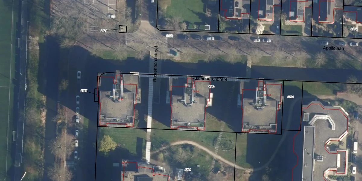 Het perceel waarop Rustenborchdreef 64 staat heeft een oppervlakte van 3042 m². Dit is een zeer groot perceel. De perceeloppervlakte wordt geregistreerd door het Kadaster. Gedetailleerde informatie over de maten van dit perceel kunt u vinden in het rapport Kadastrale kaart met maatvoering van Rustenborchdreef 64.