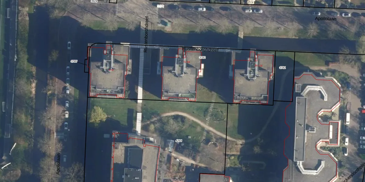 Het perceel waarop Rustenborchdreef 82 staat heeft een oppervlakte van 3042 m². Dit is een zeer groot perceel. De perceeloppervlakte wordt geregistreerd door het Kadaster. Gedetailleerde informatie over de maten van dit perceel kunt u vinden in het rapport Kadastrale kaart met maatvoering van Rustenborchdreef 82.