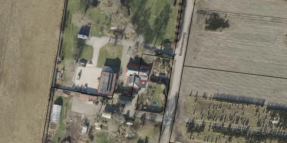 Het perceel waarop Boshoekerweg 4 staat heeft een oppervlakte van 6585 m². Dit is een zeer groot perceel. De perceeloppervlakte wordt geregistreerd door het Kadaster. Gedetailleerde informatie over de maten van dit perceel kunt u vinden in het rapport Kadastrale kaart met maatvoering van Boshoekerweg 4.