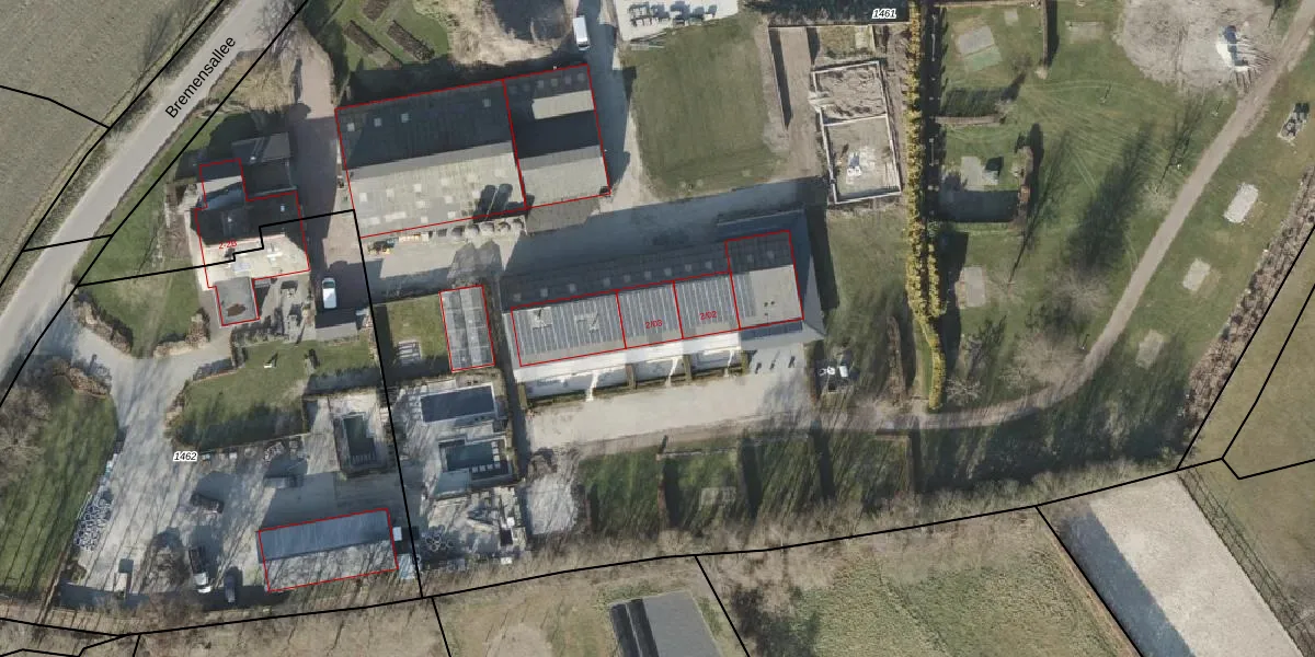 Het perceel waarop Bremensallee 2-03 staat heeft een oppervlakte van 2,5 ha. Dit is een zeer groot perceel. De perceeloppervlakte wordt geregistreerd door het Kadaster. Gedetailleerde informatie over de maten van dit perceel kunt u vinden in het rapport Kadastrale kaart met maatvoering van Bremensallee 2-03.