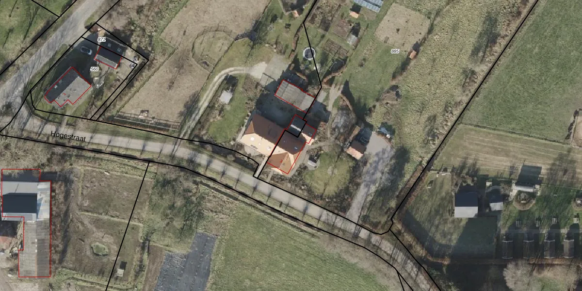 Het perceel waarop Hogestraat 3 staat heeft een oppervlakte van 6340 m². Dit is een zeer groot perceel. De perceeloppervlakte wordt geregistreerd door het Kadaster. Gedetailleerde informatie over de maten van dit perceel kunt u vinden in het rapport Kadastrale kaart met maatvoering van Hogestraat 3.