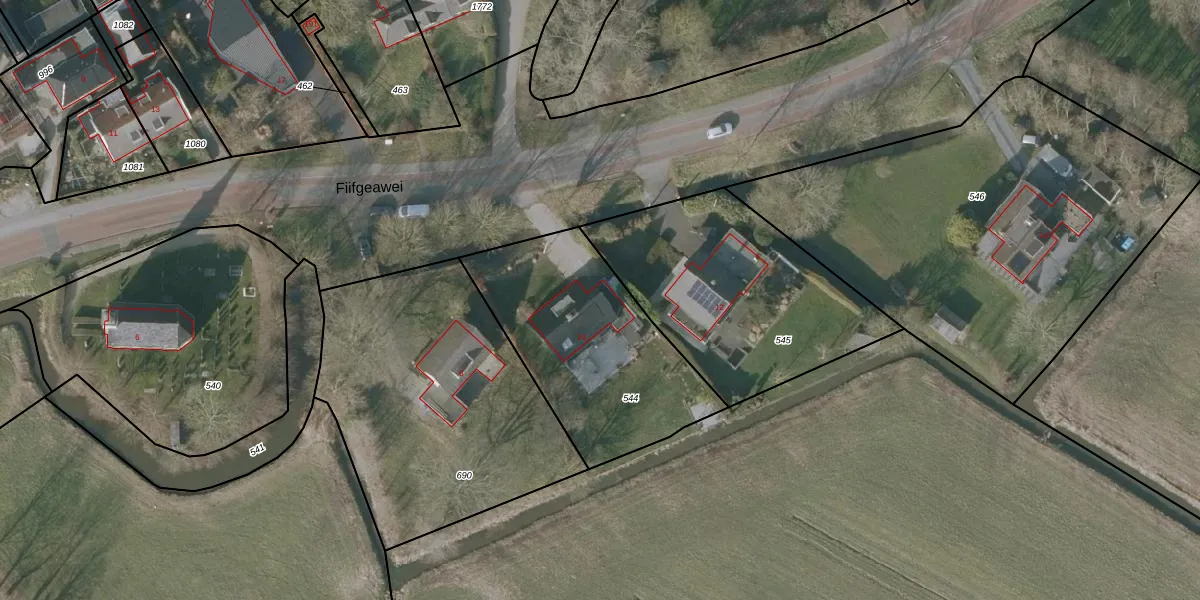 Fiifgeawei 10 is gelegen op kadastraal perceel SNE00F544. Deze kadastrale aanduiding is uniek en wordt gebruikt door het Kadaster om eigendomsrechten en andere zakelijke rechten vast te leggen. Het perceel maakt onderdeel uit van de kadastrale gemeente Sneek.