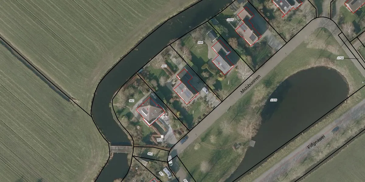 Het perceel waarop Midsbuorren 2 staat heeft een oppervlakte van 1037 m². Dit is een zeer groot perceel. De perceeloppervlakte wordt geregistreerd door het Kadaster. Gedetailleerde informatie over de maten van dit perceel kunt u vinden in het rapport Kadastrale kaart met maatvoering van Midsbuorren 2.