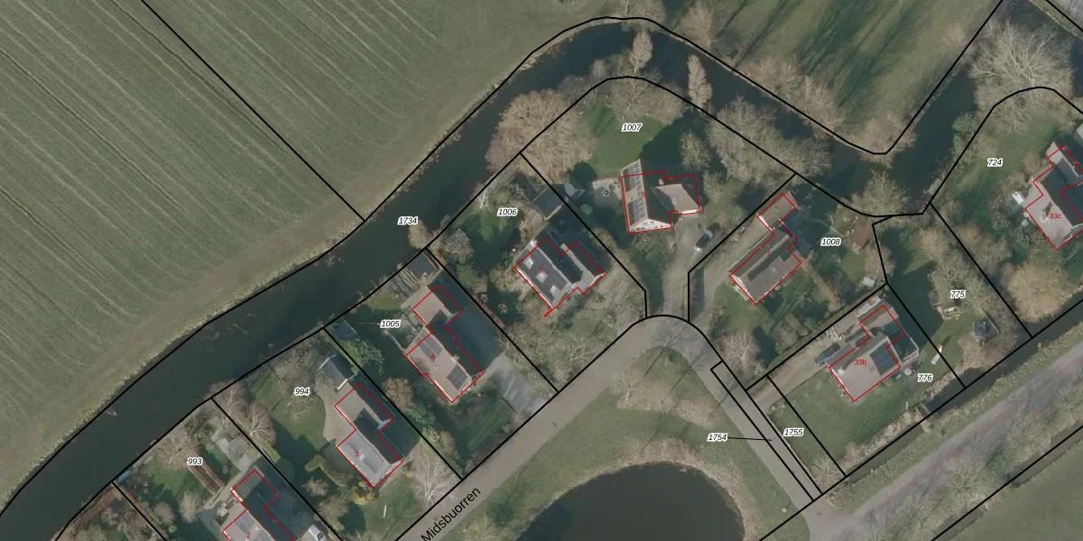 Het perceel waarop Midsbuorren 5 staat heeft een oppervlakte van 904 m². Dit is een groot perceel. De perceeloppervlakte wordt geregistreerd door het Kadaster. Gedetailleerde informatie over de maten van dit perceel kunt u vinden in het rapport Kadastrale kaart met maatvoering van Midsbuorren 5.