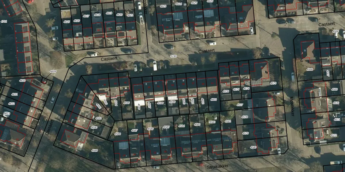 Het perceel waarop Castaert 53 staat heeft een oppervlakte van 166 m². Dit is een middelgroot perceel. De perceeloppervlakte wordt geregistreerd door het Kadaster. Gedetailleerde informatie over de maten van dit perceel kunt u vinden in het rapport Kadastrale kaart met maatvoering van Castaert 53.