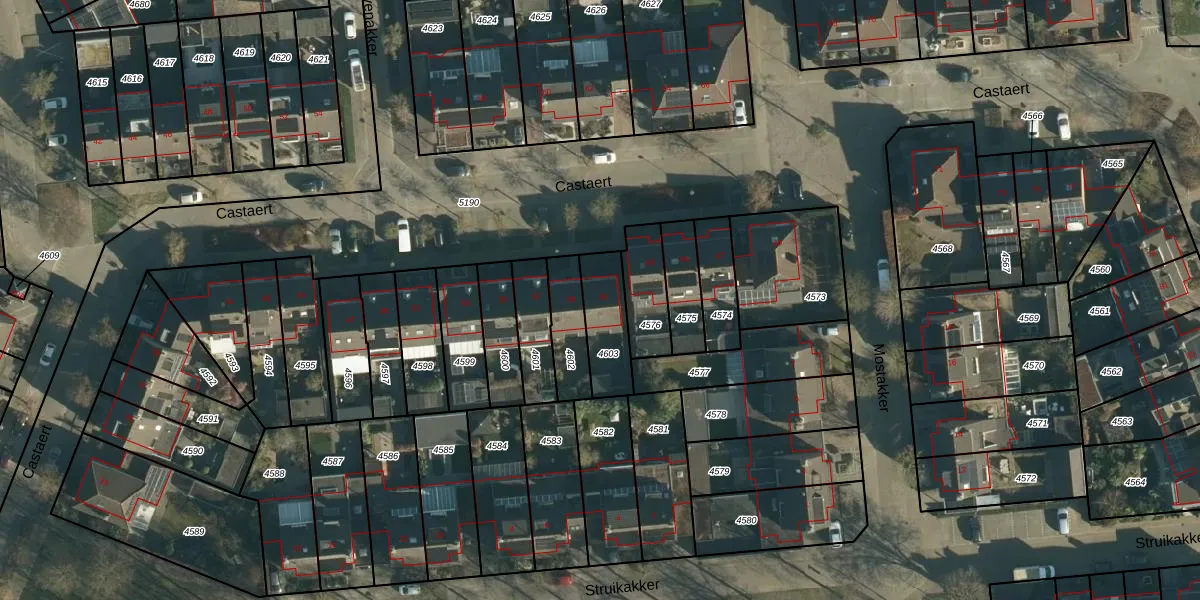 Het perceel waarop Castaert 61 staat heeft een oppervlakte van 168 m². Dit is een middelgroot perceel. De perceeloppervlakte wordt geregistreerd door het Kadaster. Gedetailleerde informatie over de maten van dit perceel kunt u vinden in het rapport Kadastrale kaart met maatvoering van Castaert 61.