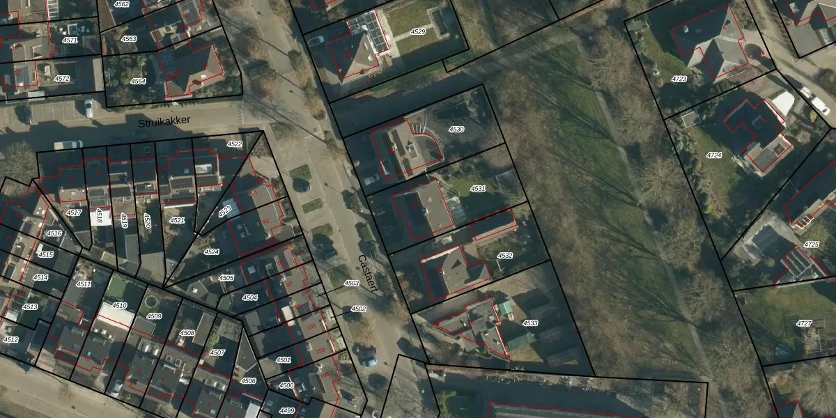 Het perceel waarop Castaert 92 staat heeft een oppervlakte van 539 m². Dit is een groot perceel. De perceeloppervlakte wordt geregistreerd door het Kadaster. Gedetailleerde informatie over de maten van dit perceel kunt u vinden in het rapport Kadastrale kaart met maatvoering van Castaert 92.