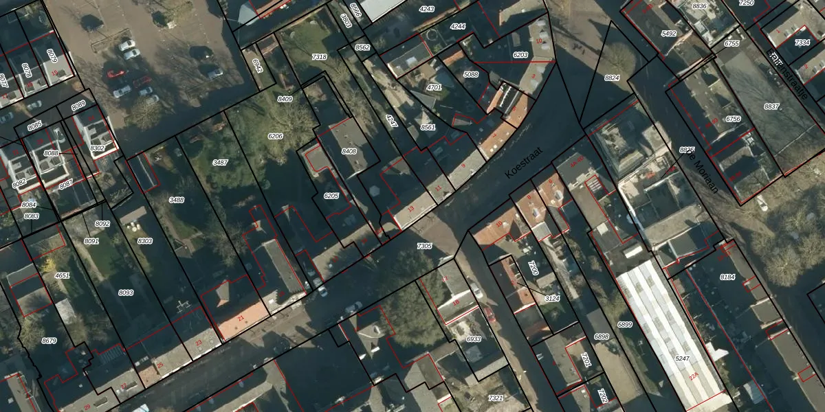 Het perceel waarop Koestraat 13 staat heeft een oppervlakte van 484 m². Dit is een groot perceel. De perceeloppervlakte wordt geregistreerd door het Kadaster. Gedetailleerde informatie over de maten van dit perceel kunt u vinden in het rapport Kadastrale kaart met maatvoering van Koestraat 13.