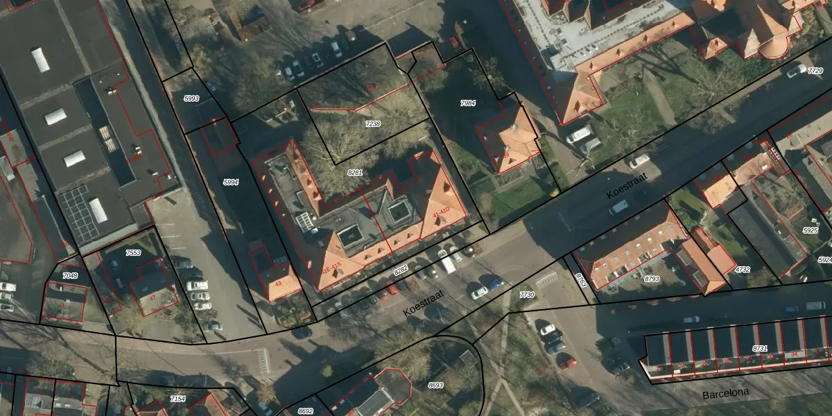 Het perceel waarop Koestraat 41-B staat heeft een oppervlakte van 1655 m². Dit is een zeer groot perceel. De perceeloppervlakte wordt geregistreerd door het Kadaster. Gedetailleerde informatie over de maten van dit perceel kunt u vinden in het rapport Kadastrale kaart met maatvoering van Koestraat 41-B.